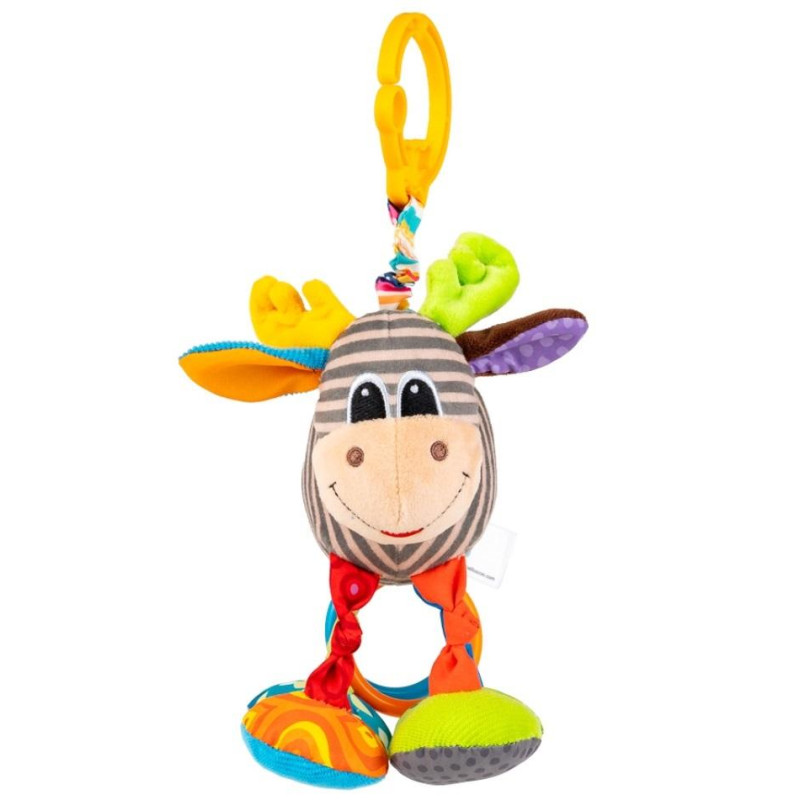 Alek to łoś do zadań specjalnych. Zabawia malucha, wesoło majtając nogami, dostarcza bodźców dotykowych, rozwijając tym samym zdolności poznawcze dziecka, a nawet wibruje! Zwierzak został uszyty z materiałów różniących się kolorem, wzorem i fakturą, a przy jego ogonku znajdują się dwa kolorowe kółeczka. Aby uruchomić wibrację, wystarczy pociągnąć łosia w dół, a ten podciągnie się na materiałowej harmonijce z powrotem w górę, zabawnie przy tym wibrując. Zwierzak wyposażony jest w praktyczną zawieszkę, dzięki czemu bez trudu przymocujesz go wybranym miejscu.