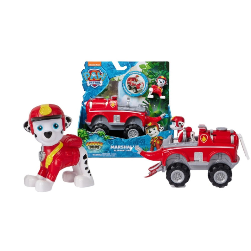 Transformujący pojazd terenowy Słoń oferuje ekscytującą przemianę w auto ratunkowe. Posadź pieska Marshalla za kierownicą i ruszajcie ku kreatywnej zabawie! Odsłoń trąbę i kły słonia - pomogą ci w usunięciu przeszkód z drogi. Wysuń drabinę, aby dosięgnąć do trudno dostępnych miejsc. Terenowy wóz Jungle Pups świetnie sprawdzi się podczas misji w dżungli. Nic go nie powstrzyma! Auto swoim wyglądem naprawdę przypomina słonia. Zostało zainspirowane bajką Paw Patrol Jungle Pups, za którą maluchy i przedszkolaki wprost przepadają!