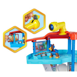 Ten ekskluzywny zestaw zawiera wieżę obserwacyjną, którą znasz z serialu, a także policyjny krążownik Chase`a i dwie figurki Chase`a - Chase po służbie i Chase-bohatera! Wieża widokowa jest idealnym punktem obserwacyjnym, aby pilnować Zatoki Przygód. Kiedy nadejdzie czas na ekscytującą akcję ratunkową, umieść Chase`a z przodu windy w wieży, a szczeniaka-bohatera Chase`a z tyłu windy. Podnieś windę, aby ją obrócić i zobacz, jak Chase po służbie przygotowuje się do akcji, gdy zmienia się w szczeniaka-bohatera Chase`a! Gdy znajdzie się na szczycie Wieży Widokowej, zatrzymaj się przy panelu sterowania misją, aby wybrać szczegóły misji na dany dzień, wybierając jedną z 3 dwustronnych kart ! Po wybraniu karty misji wybierz jedną z 3 dwustronnych kart peryskopu, aby przeglądać peryskop wieży i wiedzieć, dokąd się udać! Kiedy nadejdzie czas na super akcję ratunkową, zsuń Chase`a w dół zjeżdżalnią, aby wskoczyć bezpośrednio do policyjnego krążownika Chase`a, a następnie uderz w wyrzutnię pojazdów i wkrocz do akcji!