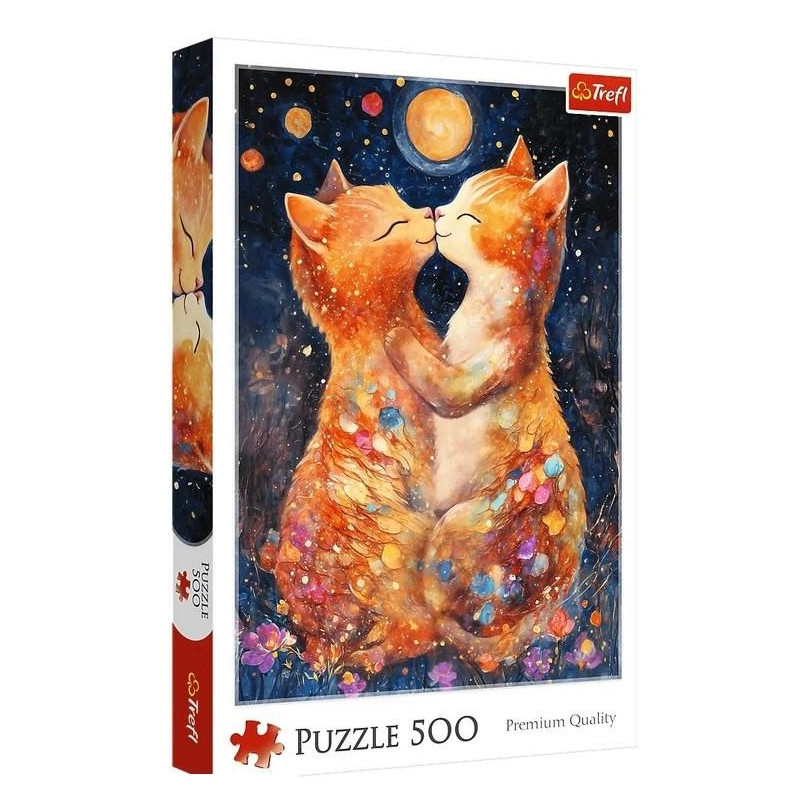 Puzzle przedstawiają dwa całujące się kotki. Produkt został wykonany w Polsce z wysokiej jakości materiałów i z dbałością o środowisko. Ponadto puzzle pokryto specjalnym kalandrowanym papierem odbijającym światło, który ułatwia układanie.