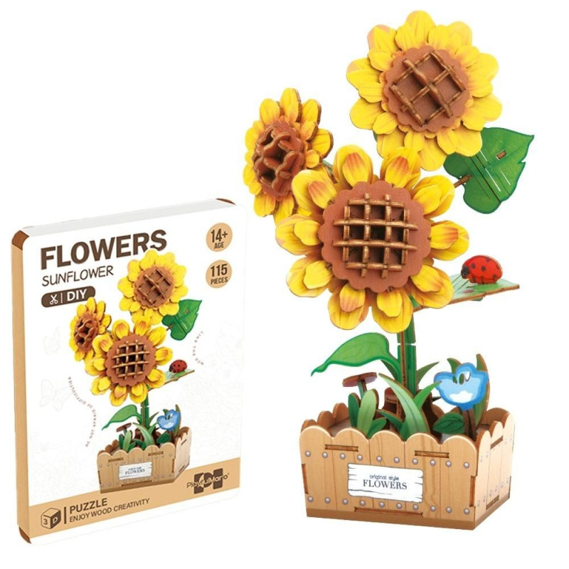 Zestaw kreatywny pozwalający na samodzielne złożenie przestrzennej kompozycji słoneczników w dekoracyjnej skrzynce. Puzzle wykonane są z naturalnego drewna i składają się z około 115 elementów, które łączy się bez użycia kleju. Model po złożeniu tworzy estetyczną, trwałą ozdobę wnętrza. Produkt rozwija zdolności manualne, cierpliwość oraz wyobraźnię przestrzenną, a jednocześnie stanowi formę relaksującej rozrywki. Przeznaczony dla młodzieży i dorosłych.