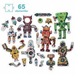 Edukacyjny zestaw zawiera 65 elementów (w tym 24 dwustronne), z których można zbudować 8 dużych robotów. Aby rozwijająca zabawa trwała jeszcze dłużej, wszystkie puzzle i części zamienne można dowolnie wymieniać, co pozwala tworzyć własne konstrukcje.