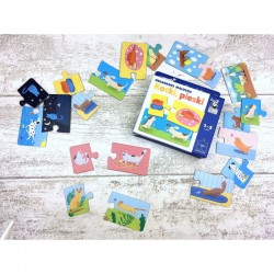 W pudełeczku zamknięto 20 elementów, z których małe rączki mogą stworzyć, aż 10 obrazkowych historyjek. Wystarczy połączyć ze sobą elementy, które przedstawiają ulubione zwierzątka dzieci - kotki i pieski. Trzeba dopasować do siebie 2 puzzle z takim samym zwierzątkiem, aby ukazał się cały obrazek. Powstałe ilustracje zachęca do tworzenia opowiadań przez co pozytywnie wpłyną na rozwój kreatywności, wyobraźni oraz mowy.