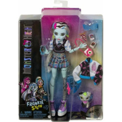 Rok szkolny już się zaczął, a uczniowie Monster High wracają na lekcje w strasznie modnym stylu. Lalka Frankie Stein robi piorunujące wrażenie w kraciastej spódniczce, bluzce z nadrukiem błyskawic i kamizelce. Elektryzujące akcesoria to buciki na platformie, łańcuszkowy pasek oraz okulary przeciwsłoneczne, kolczyki i spinki do włosów z motywem błyskawic. Stylizację Frankie Stein wzbogacają kurtka sportowa i akcesoria, takie jak plecak w kształcie błyskawicy, aparat, pizza i smartfon. Piesek Cotoś inspiruje do wymyślania opowieści o przyjaźni do grobowej deski. Dzięki punktom zgięcia w tułowiu, łokciach, nadgarstkach i kolanach możesz ustawiać Frankie Stein w dynamicznych pozach gotowych do straszenia. Dzieci od 4 roku życia mogą zebrać wszystkie lalki Monster High (sprzedawane oddzielnie), aby wymyślać własne straszystyczne opowieści z całą paczką przyjaciółek.