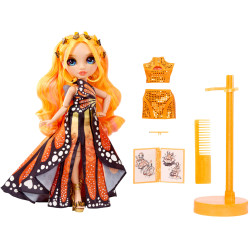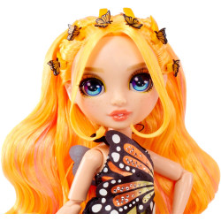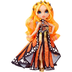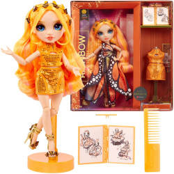 Możesz już teraz zdobyć przepiękne, kolorowe stylizacje z wybiegu zaprojektowane przez twoje ulubione postacie z serialu z Rainbow High! Modna lalka Poppy Rowan ma jasną karnację, duże niebieskie oczy i długie rude włosy. Ma zakręcone włosy z ozdobnymi wpiętymi motylami, a powieki pomalowane na kolor jasnopomarańczowy i długie rzęsy. Jej usta są różowe. Ubrana jest w śliczną sukienkę przypominającą skrzydła motyla, natomiast na nogi nałożone ma wysokie, złote obcasy z małymi motylkami. Dodatkowo w zestawie znajduje się dodatkowy zestaw ubranek: spódniczka, krótka bluzka bez rękawów.