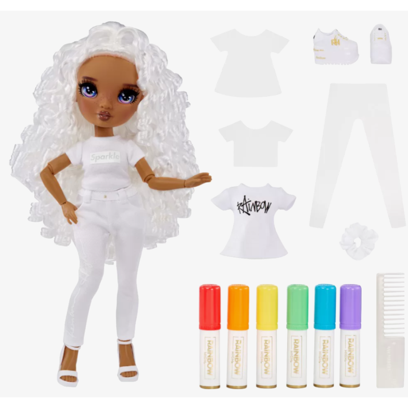 Możesz być jak uczennica słynnej szkoły i projektować własne ubrania! Stwórz własną lalkę Rainbow High! Lalka w białym stroju, którą możesz pokolorować zmywalnymi flamastrami! Modna lalka z fioletowymi oczami jest dostarczana z ubrankami i akcesoriami, które możesz samodzielnie stylizować. Do użycia masz całe tęczowe spektrum pisaków! Zabaw się we fryzjera i pokoloruj również włosy lalki! Czas na zmianę? Umyj lalce włosy i ubranie, pozwól im wyschnąć i projektuj od nowa. To takie proste! Zaprojektuj, pokoloruj, umyj, POWTÓRZ - możliwości są nieograniczone!