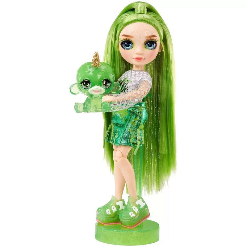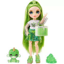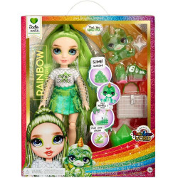 Rainbow High w ekscytujący i magiczny sposób dekorując elementy stylizacji i zwierzątka tęczowym, lśniącym slime. Zestaw zawiera wszystko, czego potrzebujesz do zrobienia błyszczącej masy. Wystarczy wymieszać żelowy proszek z brokatem, dodać wody i gotowe! Teraz możesz włożyć slime do torebki lub butów lalki, by zmieniły wygląd! Stylizacja lalki Jade Hunter jest pełna wspaniałych detali. Lalka jest ubrana w opalizującą spódniczkę, top efektowne bolerko z siateczkowej tkaniny, a jej twarz mieni się magicznymi iskierkami. Jade ma piękne zielone włosy, długie rzęsy i szklane oczy. W zestawie z lalką znajduje się jej uroczy zwierzak - małpka o imieniu Sweetpea, która ma magiczny róg.