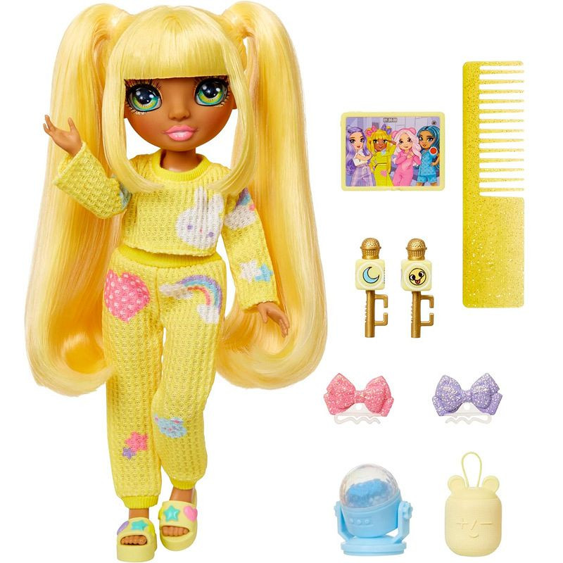 Cofnij się w czasie i poznaj historie swoich ulubionych postaci Rainbow Hihg zanim rozpoczęły naukę w liceum i stały się przyjaciółkami. Młodsze wersje kolejnych ulubionych oryginalnych modnych lalek Rainbow High to kolejna już seria, w której są takie postaci jak: Kia Hart, Avery Styles, Holly De'Vious czy Laurel De'Vious mają swoje własne historie o tym, jak odnalazły swoją twórczą pasję, zanim stały się uczennicami Rainbow High. Po raz pierwszy Twoi ulubieni przyjaciele z gimnazjum Rainbow High urządzają całonocną imprezę piżamową! Sunny Rainbow High Jr High PJ Party ubrana jest w uroczy dwuczęściowy, żółty komplet piżamowy i dopasowane żółte kapcie. Ma uroczą młodszą twarz, piękne długie proste włosy spięte w dwa kucyki z kokardkami i krótką grzywkę, długie rzęsy i szklane oczy. Każda przyjaciółka przynosi ulubione akcesoria na Pajama Party - motywem Sunny jest muzyka, a wśród jej akcesoriów znajdziesz zestaw mikrofonowy, przenośne głośniki, światła dyskotekowe i żółty tablet
