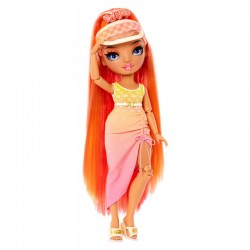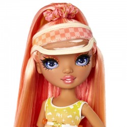Zrelaksuj się na plaży i ciesz się słońcem z Simone Summers i szóstką jej nowych przyjaciół. Te 6 dziewczynek i 1 chłopiec będą najbardziej kolorową i stylową ekipą na plaży z modnymi kostiumami kąpielowymi, nakryciami głowy, kapeluszami, letnimi butami i torbą plażową, w której zmieszczą się ich ręczniki i inne akcesoria. Każda lalka ma wyjątkowe rysy twarzy, długie rzęsy oraz piękne włosy, które dziewczynki mogą czesać i stylizować (przed pierwszym czesaniem należy umyć lalce włosy). Ponadto posiadają super funkcje, przeguby kończyn umożliwiają ustawienie lalek w dowolnej pozie. Ramiona i nogi zginają się, gdy nadajesz im kolejną efektowną pozę. Dodatkowo seria Pacific Coast po raz pierwszy wprowadza nową formę ciała, o płaskich stopach. Zestawy zawierają dodatkową parę wymiennych nóg: nogi z wygiętymi i płaskimi stopami (wyjątek lalka Finn Rosado, ma wyłącznie płaskie stopy). Każdy zestaw z serii 1 Pacific Coast zawiera jedną lalkę Rainbow High, komplet ubranek do miksowania i tworzenia własnych zestawień oraz akcesoria. Dzięki stojakowi i różnym punktom artykulacji - lalki można ustawiać w wielu dowolnych pozach. Każdy szczegół ich outfitu jest dopracowany i dopasowany do całości.