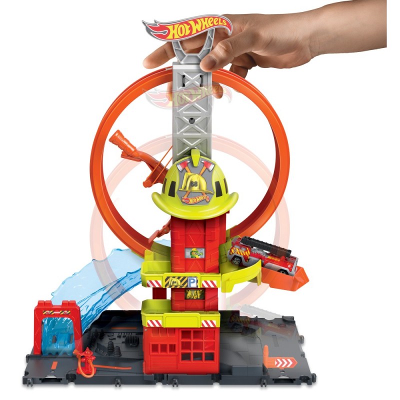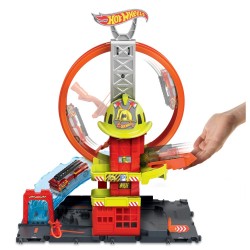 Remiza strażacka to odjazdowa konstrukcja, dzięki której możliwe będzie organizowanie jeszcze ciekawszych przejazdów, szczególnie że posiada wielką super pętlę, po której będzie musiał przejechać wóz strażacki. Konstrukcja zawiera również dwa miejsca parkingowe, bramę zjazdową, hydrant, a także przeszkodę w formie ruchomego kasku strażackiego, który dzieciaki mogą ustawiać w całkowicie dowolnej wysokości. Platformę z remizą maluchy mogą połączyć z innymi zestawami serii Hot Wheels, by cieszyć się jeszcze ciekawszą zabawą.