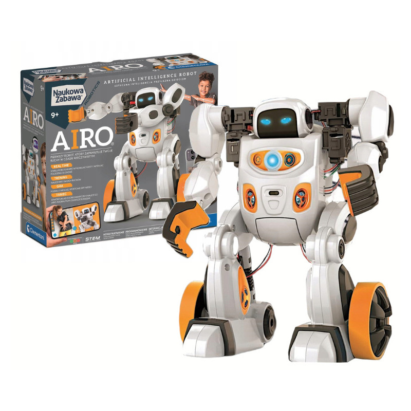 Pierwszy Robot, który zapamiętuje twoje ruchy w czasie rzeczywistym. Możesz sterować robotem AIRO wykonując gesty i wydając polecenia głosowe, naucz AIRO swoich ruchów. Poznaj 3 wesołe, sportowe gry wideo, stwórz układ choreograficzny i naucz go. Nagraj film i zatańczcie razem.