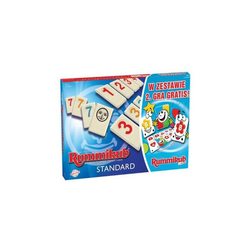 Rummikub 2w1 + Junior gry firmy TM Toys. Rummikub to bardzo wciągająca gra, inna w każdej kolejnej rozgrywce dzięki kolejnym rozdaniom klocków. W grze posługujemy się 104 kośćmi z liczbami w czterech kolorach o wartościach od 1 do 13 oraz dwiema z symbolami jokerów. Do gry dołączone są też specjalne stojaki na kości, aby każdy zawodnik mógł je swobodnie rozłożyć z dala od wzroku innych graczy. Wygrywa ten, kto pozbędzie się wszystkich kości i zawoła Rummikub. Zestaw zawiera 2 gry.Liczba graczy 2-4Wiek 3+ Ostrzeżenie:Nieodpowiednie dla dzieci w wieku poniżej 36 miesięcy. Małe części.