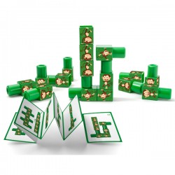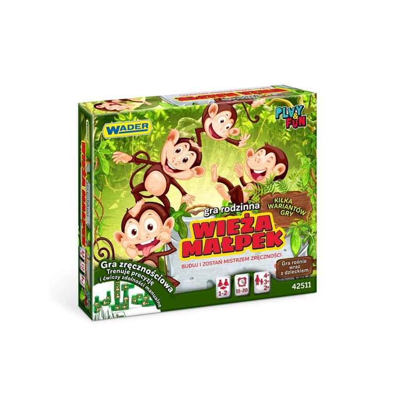 Małpia wieża spodoba się najmłodszym dzieciom (2+), trochę starszemu rodzeństwu, mamie, tacie oraz babci i dziadkowi, bo w każdym wieku powinno się trenować mózg i zmysł równowagi. Każdy gracz otrzymuje zestaw klocków z wizerunkami małpek w trzech różnych pozycjach: stojących na stopach, na rękach oraz poziomo przeskakujących z drzewa na drzewo. Zadaniem graczy jest zbudowanie wieży z klocków-małpek. W zależności od wariantu gry, wieżę należy ustawić w jak najkrótszym czasie (wariant 1 lub 2) lub zgodnie z rysunkami przedstawionymi na kartach (wariant 3). W dwóch pierwszych wariantach, uczestnik gry może zdecydować się na budowanie wieży na poziomie amatorskim, zawodowym lub mistrzowskim. Zadanie zostaje zaliczone jeżeli ustawiona wieża utrzyma się minimum 10 sekund. Rozwija koordynację wzrokowo-ruchową co jest szczególnie ważne dla prawidłowego rozwoju dziecka i uczenia się w szkole. Gra wpływa na rozwój refleksu i zmysłu równowagi. Dala 2-3 graczy. Zawartość: