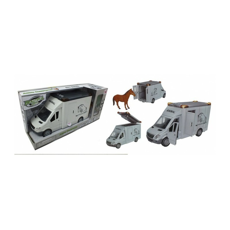 Realistycznie wyglądające auto do przewozu koni wraz z figurką zwierzęcia. Auto nie tylko generuje efekty świetlne, ale również dźwiękowe. Uruchamiamy je za pomocą przycisków umieszczonych na dachu. Drzwi oraz bagażnik są otwierane. Dzięki temu możemy włożyć konika do środka. Kabina zawiera w środku wszystkie elementy charakterystyczne dla kabiny prawdziwego pojazdu (kierownica, kokpit, siedzenia, skrzynia biegów). Opony są gumowe i odznaczają się wyraźnie oznaczonym bieżnikiem. Z boku przyczepy zobaczymy grafikę skaczącego konia, która dobrze komponuje się z tym typem pojazdu. W zestawie: pojazd, figurka konia Baterie: 2xAA (dołączono) Wymiary opakowania: 39x12x18cm
