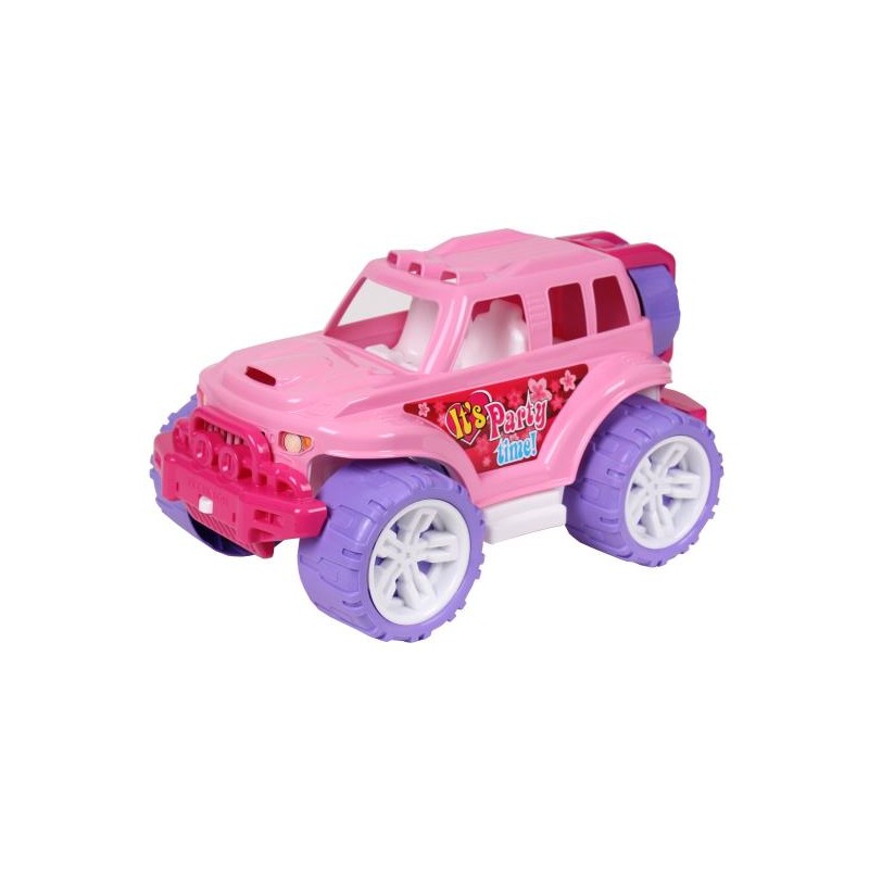 Luksusowe auto terenowe wykonane w delikatnej różowo - fioletowej kolorystyce. Terenówka posiada koło zapasowe, które przymocowane zostało do tylnych drzwi. Auto z pewnością przypadnie do gustu małym fanom lalek Barbie i Kena.
