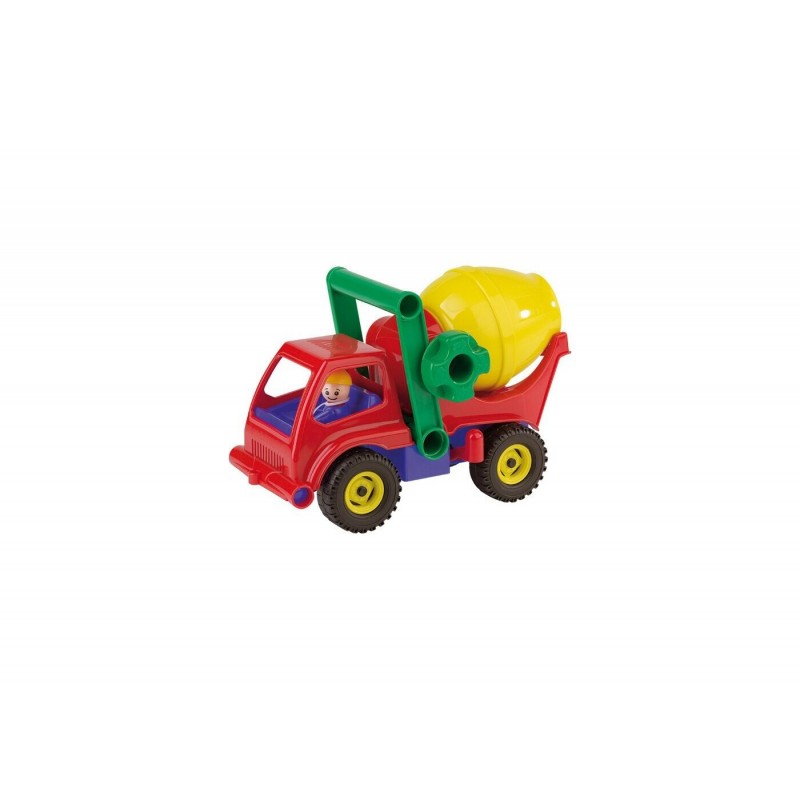 Kolorowa betoniarka, wykonana z elastycznego plastiku wysokiej jakości, spełniającego normy europejskie. Funkcjonalne autko, bęben można obracać oraz przechylić aby wysypać np. piasek.