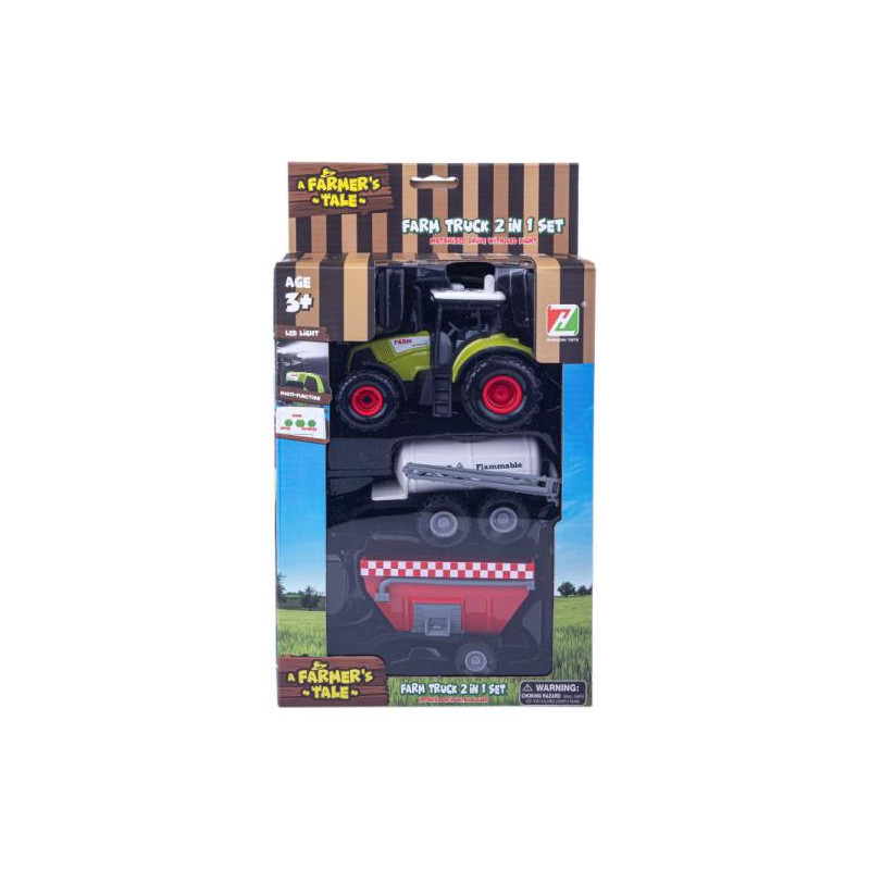Traktor z dwiema maszynami rolniczymi, zabawka dla wszystkich wielbicieli pojazdów rolniczych. Zabawka zasilana jest bateriami, dzięki czemu traktor wydaje dźwięki, a światła pojazdu świecą.