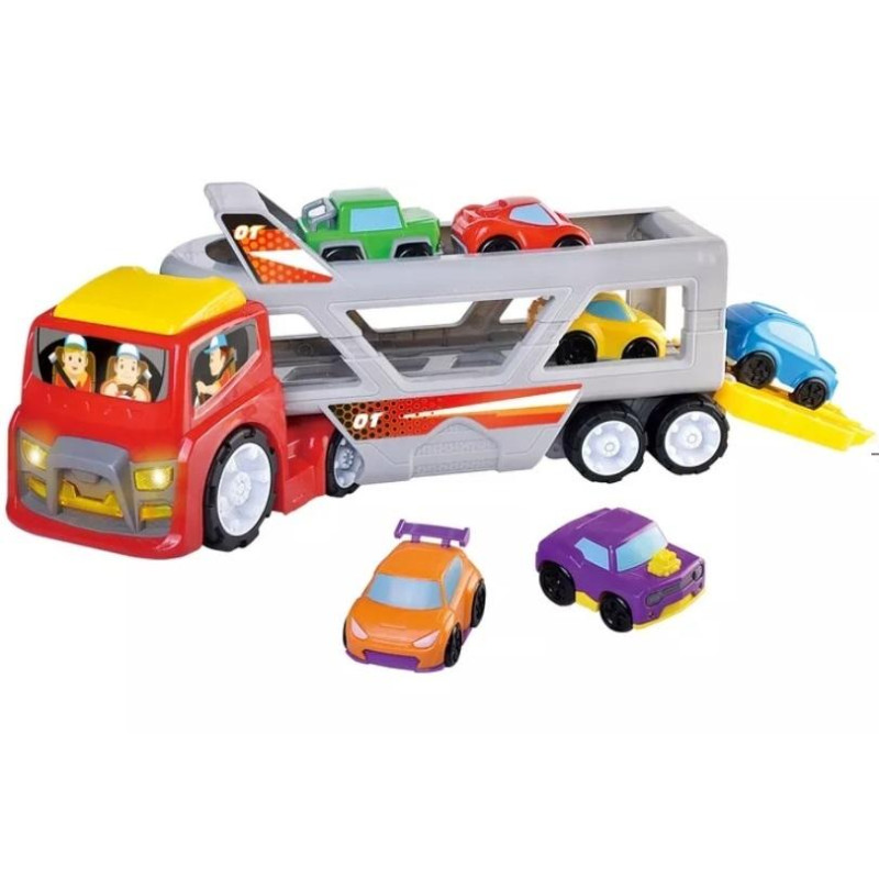 Przewoź samochodziki i ciesz się realistycznymi, odgłosami! W zestawie znajduje się duża laweta ze światełkami, dźwiękami i melodią oraz 6 małych samochodzików, które mieszczą się idealnie na dwóch poziomach lawety. Każdy z samochodów ma inny kształt i kolor, więc bez trudu je odróżnisz. Laweta została wyposażona w rampę z opuszczanym wjazdem, co ułatwia samochodzikom wjazd "na pokład" i zajęcie miejsca na jednym z poziomów.
