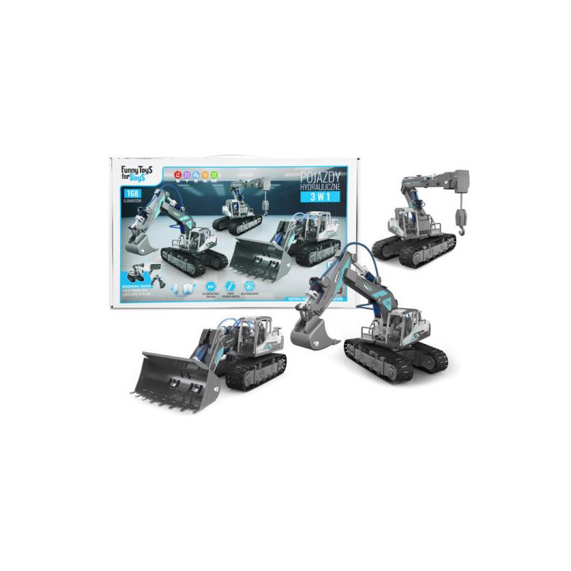 Super pojazd hydrauliczny z trzema akcesoriami wymiennymi 3w1 do samodzielnego złożenia. Model wykorzystuje trzy układy hydrauliczne służące do wykonywania odpowiednich czynności. Posiada ruchome elementy, które możemy kontrolować za pomocą specjalnych drążków. Platforma złożonego pojazdu ma możliwość obrotu o 360°. Samodzielne składanie pojazdu hydraulicznego pobudza wyobraźnię dziecka i zapewnia mnóstwo radości. Zabawka wprowadza najmłodszych w zastosowanie zasady Pascala i prawa zachowania energii oraz rozwija umiejętności praktyczne. Produkt został umieszczony w wygodnym opakowaniu z rączką. Cechy produktu: - zabawka do samodzielnego składania, - kontrola ruchów pojazdów za pomocą drążków, - zabawa hydromechaniczna, - rozwija zdolności logicznego myślenia. - nie wymaga użycia baterii.