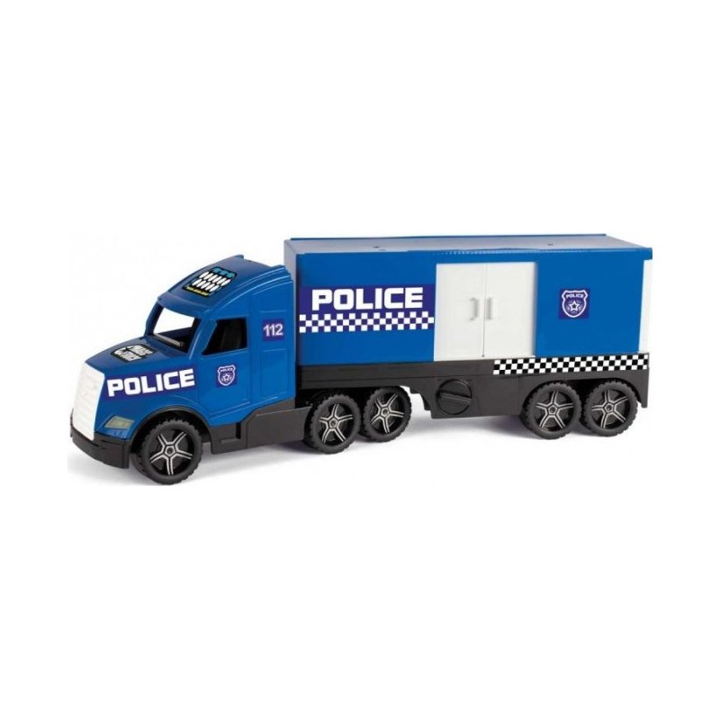 Magic Truck Action to niepowtarzalna seria dużych pojazdów, o których marzy każde dziecko. Stworzone z pasją, są odzwierciedleniem prawdziwych ciężarówek. Policja w kolorze niebieskim z białymi akcentami posiada skrętną skrzynię ładunkową, którą można przyczepić do pojazdu na 2 sposoby. Kontener posiada rozsuwane drzwi boczne oraz otwieraną tylną klapę, dzięki którym można do niego ładować różne przedmioty. Naczepa posiada wysuwane nóżki podporowe, które pozwalają stworzyć z niej samodzielną przyczepę. Auto z przodu ma zamontowane fluorescencyjne światła, które po naświetleniu świecą w ciemnościach. Pojazd wykonany jest z materiałów bezpiecznych dla dzieci. Ogromną zaletą jest trwałość i wytrzymałość konstrukcji, co sprawia, że zabawka może służyć dzieciom latami.