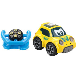 Fantastyczny sterowany samochód dla najmłodszych jest w bardzo wyrazistym żółtym kolorze. Wyposażony w efekty specjalne. Znajdziemy tu dźwięk, światełka, funkcję jazdy oraz podążania za pilotem. Kiedy więc dziecko weźmie pilot do ręki i naciśnie odpowiedni przycisk, samochodzik posłusznie pojedzie za nim. W tylnej części pojazdu znajduje się schowek na pilot, dzięki czemu, po skończonej przejażdżce można go tam umieścić, aby bezpiecznie czekał na kolejną zabawę. W zestawie znajduje się także obrotowy stojak, który, po umieszczeniu w nim pilota, zmieni się w kierownicę.
