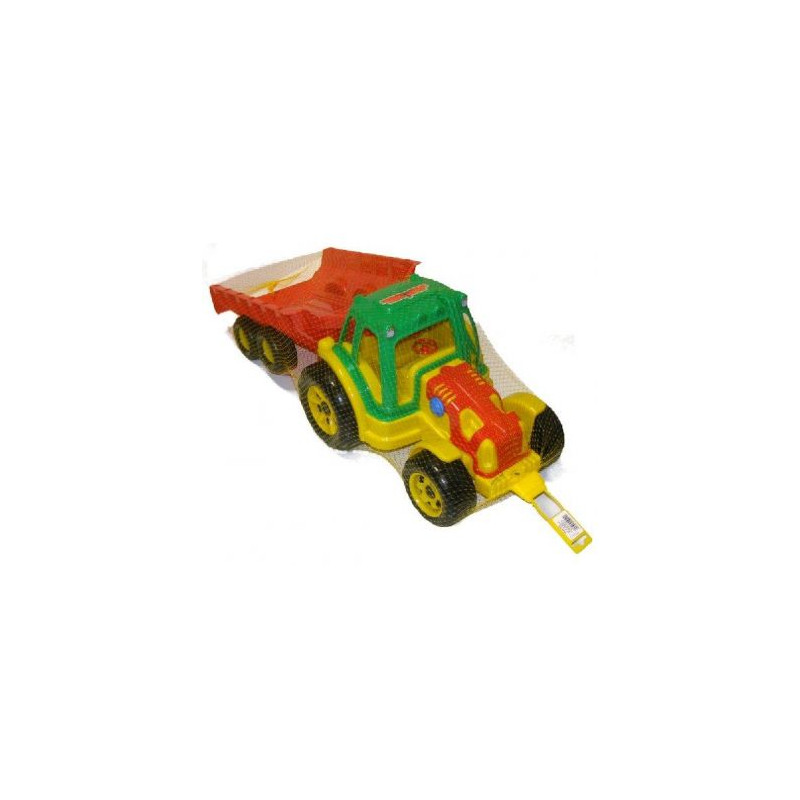 Duży traktor wykonany z dobrej jakości tworzywa. Traktor posiada ruchome elementy oraz duże koła z wyraźnie zaznaczonym bieżnikiem. Pojazd posiada otwartą kabinę bez szybek oraz zaczep z przodu kabiny na sznurek. W zestawie z przyczepką na czterech kołach.
