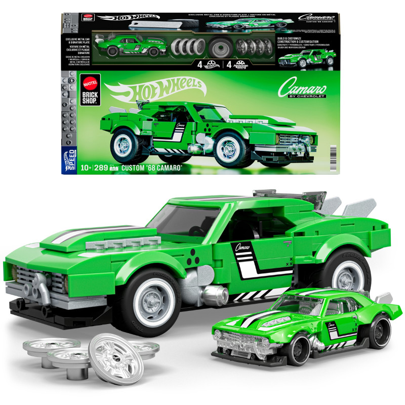Zestaw to replika prawdziwego pojazdu w skali 1:32 oddaje charakterystyczne linie i proporcje kultowego Camaro ’68. Model z otwieranymi drzwiami i realistycznym tylnym spojlerem. Auto posiada metaliczne rury wydechowe, starannie odwzorowana osłona silnika i detale wnętrza. W komplecie dołączone są naklejki oraz dwa zestawy felg – możesz zmieniać styl auta, eksperymentuj z kolorami i wzorami, stworzysz Swój projekt. W zestawie umieszczono miniaturowy model Camaro w skali 1:64 oraz metalową tabliczkę Hot Wheels - doskonałą jako breloczek lub ozdoba kolekcji. To pierwszy raz, gdy Mattel Brick Shop oferuje tak prestiżowy metalowy dodatek!