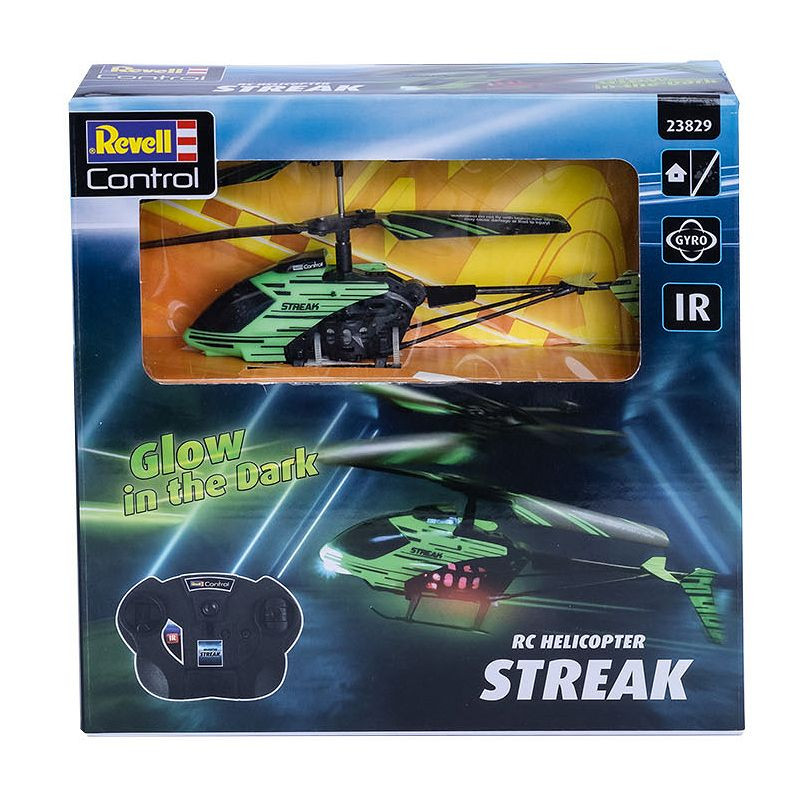 Podwójny efekt dzięki wbudowanym diodom LED, model Streak świeci w ciemności. Dzięki 2-kanałowemu sterowaniu podczerwienią (IR), pilot musi się skupić tylko na kontrolowaniu wysokości oraz kierunku lewo/prawo; do przodu helikopter leci automatycznie. Elektroniczny żyroskop i system podwójnego wirnika stabilizują model w powietrzu. Ładowanie helikoptera odbywa się wygodnie i bezprzewodowo na pilocie zdalnego sterowania.