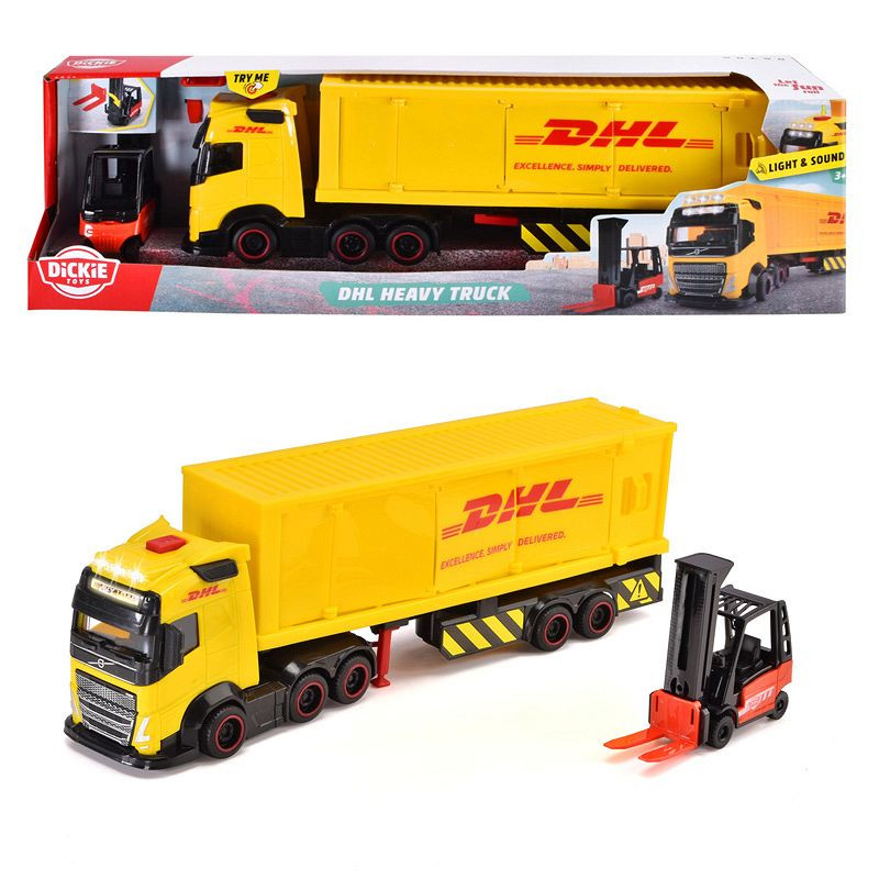 DICKIE CIĘŻARÓWKA VOLVO Z NACZEPĄ DHL I WÓZKIEM WIDŁOWYM