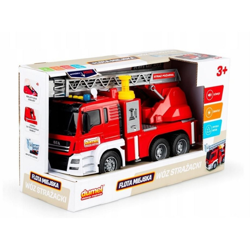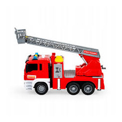 Fajny wóz strażacki wyposażony został w najprawdziwszy zbiornik na wodę wraz z wężykiem i armatką wodną, pozwalającą na pryskanie wodą. Znajdziemy tu ruchome elementy korbkę do podnoszenia drabiny oraz ręcznie rozsuwaną drabinę. Wóz strażacki posiada także aktywne przyciski na dachu, aktywujące realistyczne odgłosy i światełka. Dodatkowo, gdy rozpędzisz koła pojazdu, poprzez tarcie nimi o podłoże, pojazd pojedzie sam do przodu.
