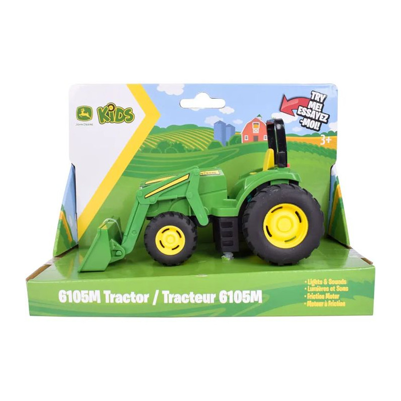 Model został wykonany w charakterystycznej zielono-żółtej kolorystyce marki, a jego solidna konstrukcja sprawia, że nadaje się do intensywnej zabawy. Zabawka wyposażona jest w funkcję świateł i realistycznych dźwięków, które dodatkowo uatrakcyjniają zabawę i pozwalają dzieciom poczuć się jak prawdziwi rolnicy. Model posiada napęd typu friction motor, który pozwala na swobodne poruszanie się po podłodze po lekkim popchnięciu. Podnoszona przednia łyżka umożliwia przenoszenie drobnych przedmiotów, co pozwala dzieciom odgrywać różnorodne scenariusze związane z pracą na farmie.