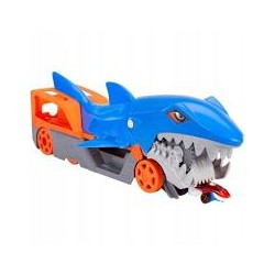 Super transporter inspirowany rekinami pożera samochody i przechowuje je w swoim brzuchu, aby transportować pojazdy Hot Wheels. W zestawie 1 samochodzik, a rekin może pomieścić 5 autek. Wiek: 4+.