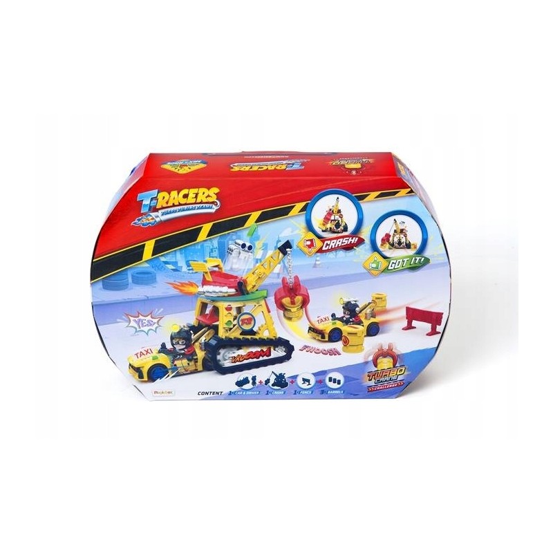 Fajny zestaw dla chłopca. Na drodze Mr Meanera pojawia się wielki dźwig. Czy kierowcy uda się przejechać pod nim bez zaczepienia się o hak lub uderzenia w beczki i płotek? Jeśli się uda wspaniale. Jego wróg zostanie wystrzelony w powietrze, a Mr Meaner będzie mógł kontynuować swój wyścig na pełnych obrotach. Każdą część można wymieniać z innymi T-Racersami, łącznie z kołami, i w ten sposób nadać każdemu pojazdowi indywidualny charakter. W serii T-Racers jest ponad 500 różnych możliwych kombinacji. Zestaw zawiera: 1 kierowcę i 1 ekskluzywny pojazd T-Racers, 1 dźwig, 1 płotek, 3 baryłki. Zabawa z t-racers wpływa na rozwój wyobraźni, pomysłowości, refleksu. Wiek 4+.