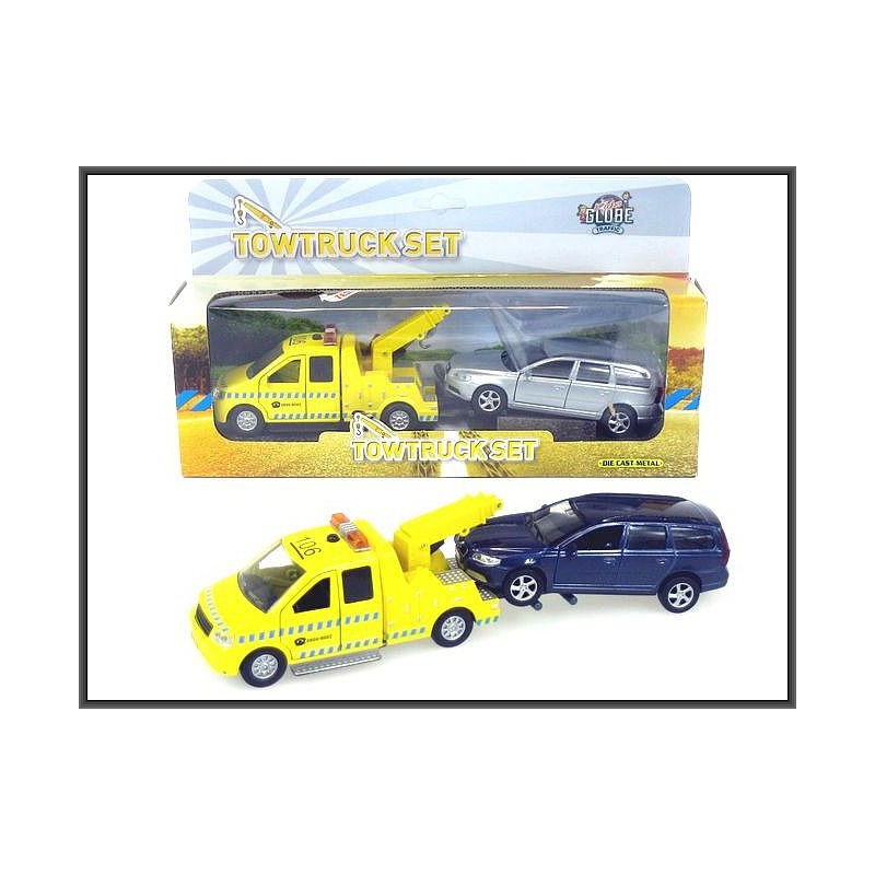 13 cm holownik jest koloru żółtego, posiada otwierane drzwi, hak oraz rampę opuszczaną na dół. Wyposażony został również w napęd. Samochód, który należy holować to srebrne lub granatowe Volvo. Samochodzik ma 13 cm i również posiada otwierane drzwi.
