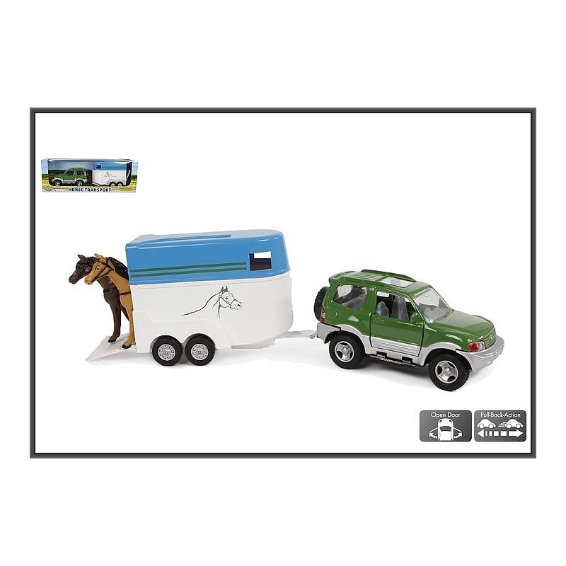 Zielony, metalowy terenowy pojazd z gumowymi kołami dla lepszej przyczepności, ciągnie za sobą biało-niebieska przyczepę z dwoma końmi. Zarówno drzwi samochodu jak i drzwi oraz klapa od przyczepy otwierają się. Terenówka posiada również napęd.