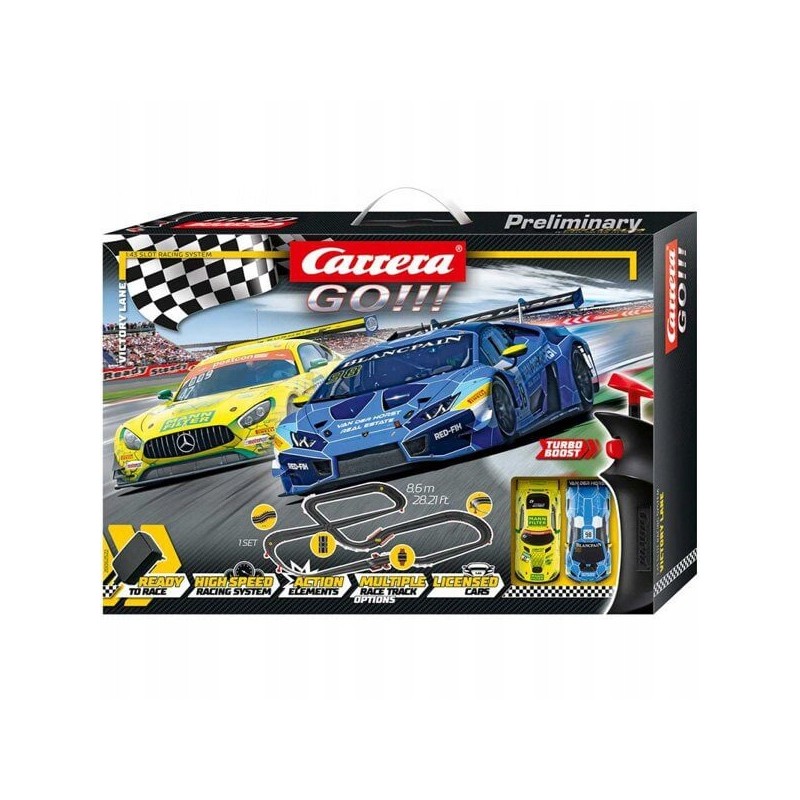Carrera Go victory lane to super długi tor samochodowy i dwa sportowe samochody, które są gotowe do dynamicznego, długodystansowego pojedynku. Dzięki niesamowitej długości toru wyścigowego wynoszącego 8,6 metra, szybkim prostym odcinkom i stromym zakrętom, ten zestaw oferuje dużo miejsca do pojedynku. Uważaj jednak: sprytne sztuczki i skrzyżowania zapewnią dużo adrenaliny. Tor jest starannie wykonany, stabilny, wymiary po rozłożeniu: ok. 250 x 145 cm. Autka i tor w skali: 1:43. Zawartość zestawu: