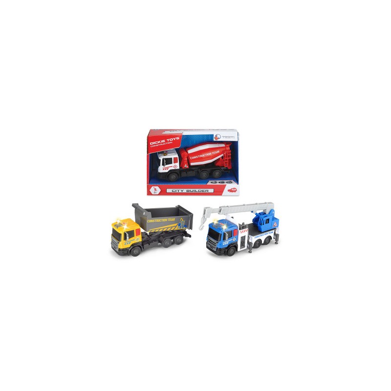 Pojazdy budowlane firmy Simba. Do wyboru 3 rodzaje: kontenerowiec, betoniarka oraz dźwig.