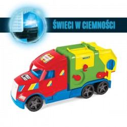 Fajna śmieciarka kontener to masywny, wytrzymały pojazd z podnoszonym kontenerem i z dwoma koszami na śmieci w zestawie. Auto z przodu ma zamontowane fluorescencyjne światła, które po naświetleniu świecą w ciemnościach. Śmieciarka wyposażona jest w ruchomy podnośnik do opróżniania pojemników, posiada otwieraną tylną klapę oraz taśmociąg do przesuwania przedmiotów w środku kontenera. Wiele ruchomych elementów sprawi, że zabawa będzie fajna. Wysoka jakość użytych materiałów pozwoli cieszyć się nią dzieciom przez długi czas. Śmieciarka z serii Magic Truck Basic pobudza wyobraźnię, wspiera aktywność ruchową dziecka oraz rozwija jego umiejętności manualne. Zabawa pozwala również na wprowadzenie elementów edukacyjnych związanym z zachowaniem czystości i porządku w domu i na podwórku. Idealna do zabawy w domu i na powietrzu. Pojazd ma 60 cm, jest zapakowany w ładne, kartonowe opakowanie. Wiek 3+.