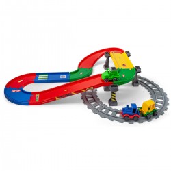 Fajny zestaw 3,4 metrowej trasy, na którą składają się tory kolejowe, elementy autostrady pociągi oraz 3 pojazdy. Dodatkowo w komplecie znajdują się filary pozwalające na skonstruowanie wiaduktu i zestaw 48 naklejek. Zaletą produktu jest kolorowa, lekka, prosta w montażu, a jednocześnie bardzo stabilna konstrukcja oraz różnorodność elementów, dzięki którym budowanie staje się o wiele ciekawsze i angażujące. Wszystkie elementy wykonane są z wysokiej jakości bezpiecznego dla dzieci i trwałego tworzywa. zabawka pobudza wyobraźnię i kreatywność dziecka, stymuluje rozwój zmysłów. Komplet zapakowany w ładne pudełko, idealny na prezent. Wiek 1+.