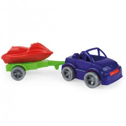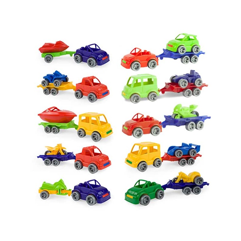 Zestawy autek z przyczepą z serii Kid Cars to 10 różnych wariantów. Różnorodne i kolorowe modele samochodów (jeep, buggy, pickup, bus) z przyczepą, a na niej do wyboru: motorówka, skuter wodny, skuter śnieżny, quad, formuła, wyścigówka, buggy i kabriolet. Cena za 1 sztukę tj. zestaw autko i przyczepa, wysyłka losowa, jeśli zależy Ci na konkretnym wzorze zaznacz to w zamówieniu, a w razie dostępności wyślemy dany model. Zestaw ma ok 25 cm. Zabawa autkami stymuluje rozwój zmysłów i wyobraźni. Wiek 1+.
