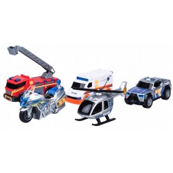 W zestawie znajduje się 5 pojazdów ratunkowych. 4 pojazdy są zasilane bateriami: ambulans, straż pożarna, samochód policyjny i motocykl policyjny), dzięki czemu wydają realistyczne odgłosy i świecą światłami. Helikopter ma śmigła, które można ręcznie obracać. Zabawa autkami rozwija wyobraźnię, kreatywność. Pojazdy wyposażone w :