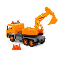 Ciężarówka-koparka zapakowana jest w kartonowe pudełko. Koparka dostępna jest w kolorze pomarańczowym. Idealna do zabawy w domu i na powietrzu.