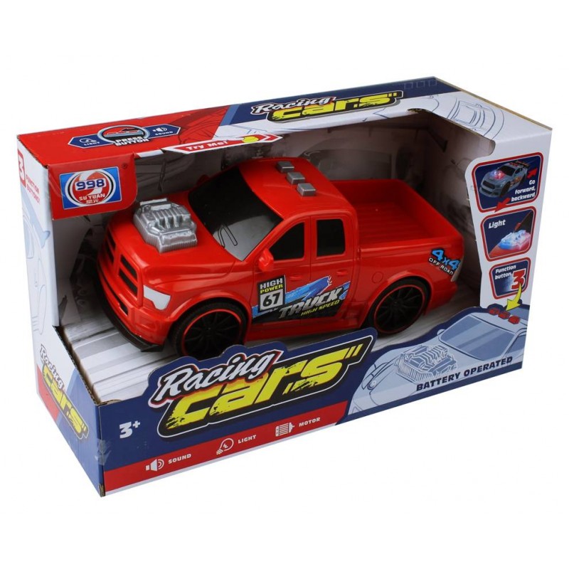 Czerwony, plastikowy samochód na baterię. Posiada 3 przyciski funkcyjne, które uruchamiają jazdę w przód, tył oraz efekty dźwiękowe i świetlne.