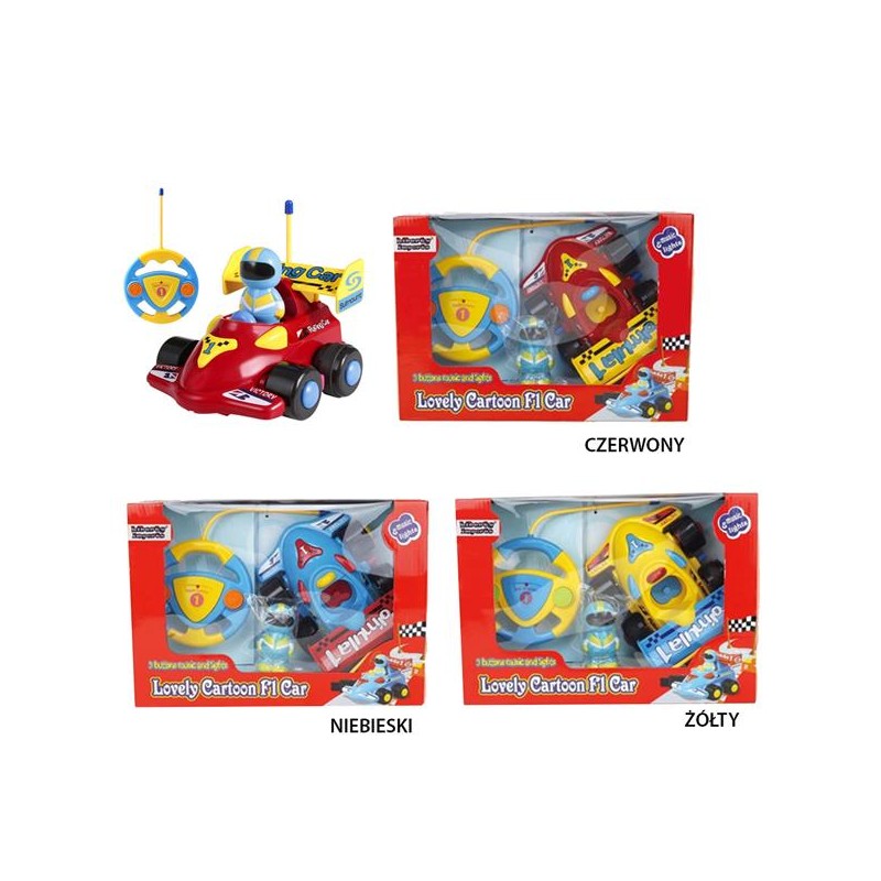 Mini wyścigówka na sterowanie dla każdego malucha. Za jej kierownicą siedzi mały kierowca. Do zestawu załączono pilot w kształcie kierownicy, który umożliwia jazdę we wszystkich kierunkach.