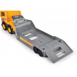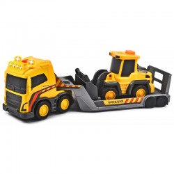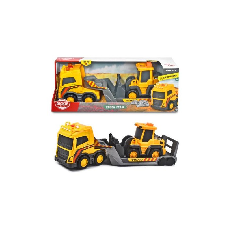 Volvo Truck Team, ma 32 cm na licencji marki Volvo. Zabawka składa się z ciężarówki z funkcją światła i dźwięku, przyczepy z ruchomym podjazdem, na której znajduje się 9 cm ładowarka marki Volvo. Ładowarka posiada ruchomą łopatę, którą można ładować różne przedmioty na domowej budowie. Dodatkowo, przyczepa na której przewożona jest ładowarka może być odczepiana, dzięki czemu dziecko może bawić się każdym elementem zestawu osobno. Baterie: 2 x 1,5V LR44 - w zestawie testowe. Wymiary 32 cm, kolory żółty / szary. Zestaw zadowoli każdego fana pojazdów budowlanych.