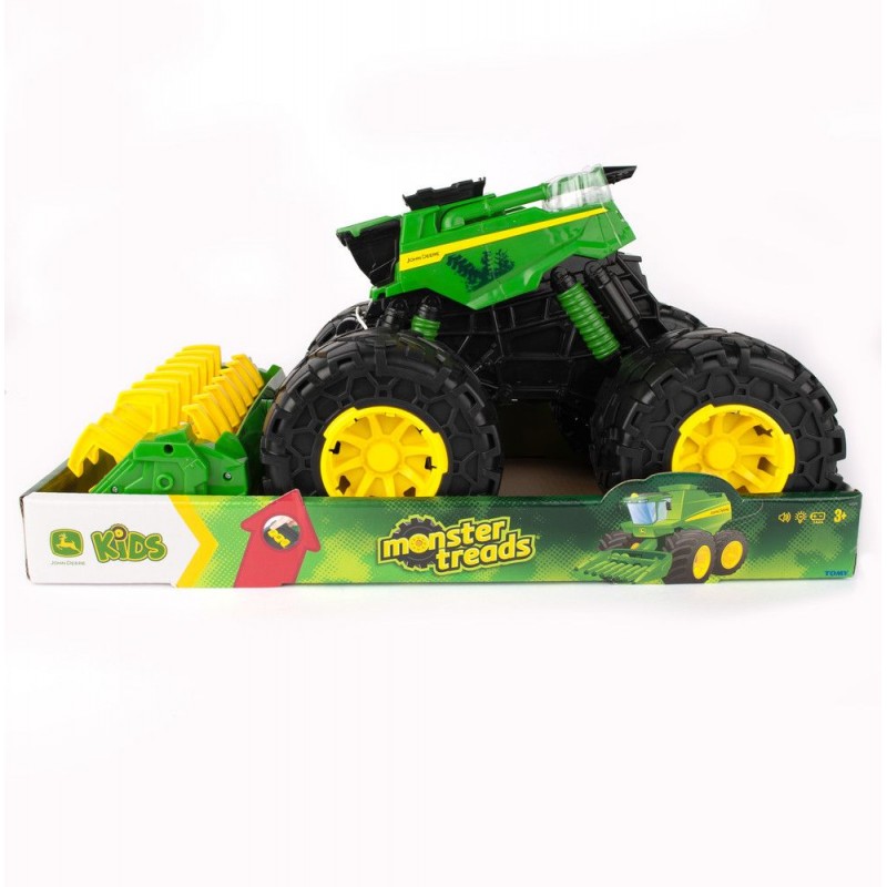 Pojazd ma aż 45 centymetrów długości! Jego wysokość, to aż 23 centymetry! Kombajn osadzony jest na 14-centymetrowych sprężystych oponach z wyraźnym terenowym bieżnikiem. Na froncie maszyny znajduje się ruchomy heder, który obraca się, kiedy kombajn jest w ruchu. Duże opony Monster Treads ułatwiają pokonywanie nawet największych przeszkód i pozwolą na przemieszczanie się po różnych powierzchniach! Naciśnij 3 przyciski na górze kabiny, aby włączyć realistyczne dźwięki silnika, klaksonu i uruchomić migające światła! Ten niesamowity pojazd będzie świetnym prezentem dla każdego chłopca zafascynowanego maszynami rolniczymi!