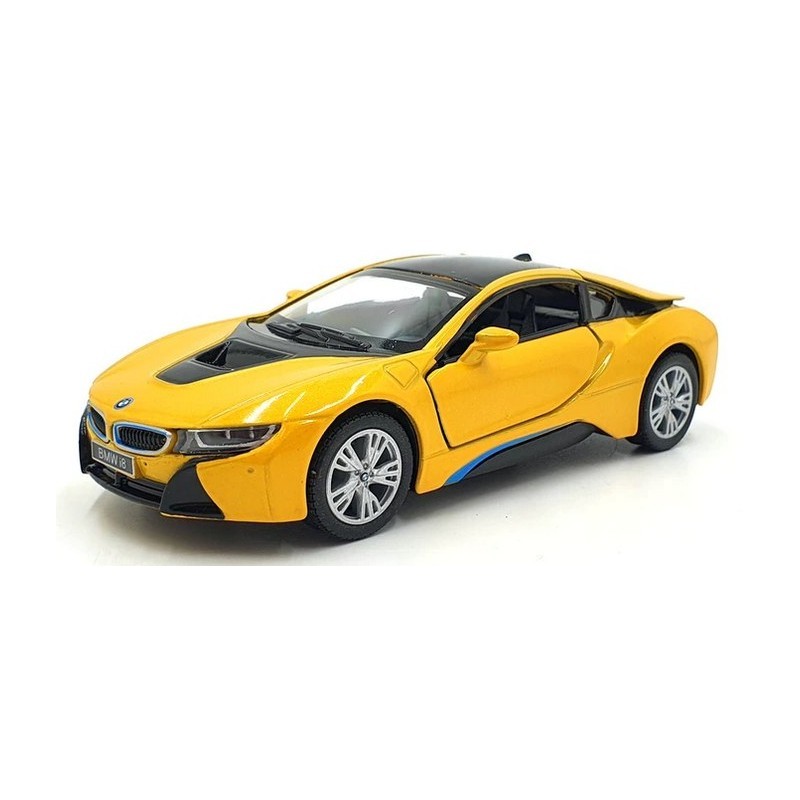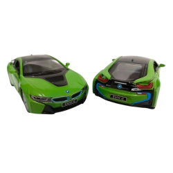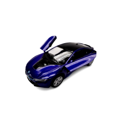 Model sportowego samochodu BMW i8. Wykonany z metalu, zawiera elementy plastikowe. Posiada wbudowany napęd pull-back.