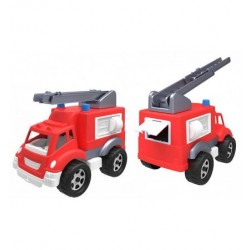 Auto (straż pożarna) z kaskiem na głowę dziecka. Pojazd ma zamontowaną drabinę, która nie tylko jest wysuwana, ale również obraca się o 360 stopni. Obok niej znajdują się niebieskie elementy imitujące strażacki sygnał świetlny. Po bokach wozu ulokowano szczegóły, które odwzorowują boksy wypełnione akcesoriami strażackimi (np. kilof, wąż). Z tyłu znajdziemy otwieraną klapę, dzięki której dostaniemy się do przestronnego bagażnika z podestem. Do zestawu dołączono kask. Dziecko może jeszcze bardziej urealnić swoją zabawę poprzez jego noszenie.