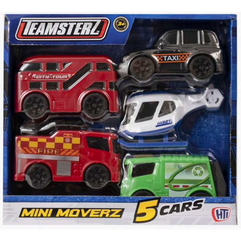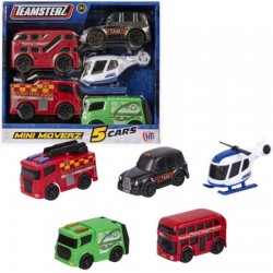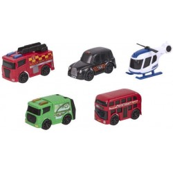 Zestaw składa się z 4 samochodów i helikoptera, w tym: piętrowego autobusu, wozu strażackiego, czarnej taksówki, śmieciarki.