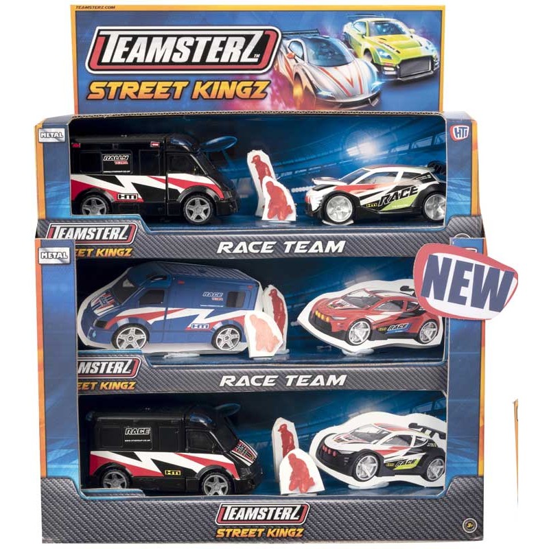 Ten zestaw drużynowy zawiera samochód rajdowy z otwieraną maską oraz furgonetkę. A przy pomocy dołączonych figurek mechaników nie ma wątpliwości, że zdobędziesz trofeum za 1 miejsce! Wszystkie pojazdy posiadają swobodnie poruszające się koła.